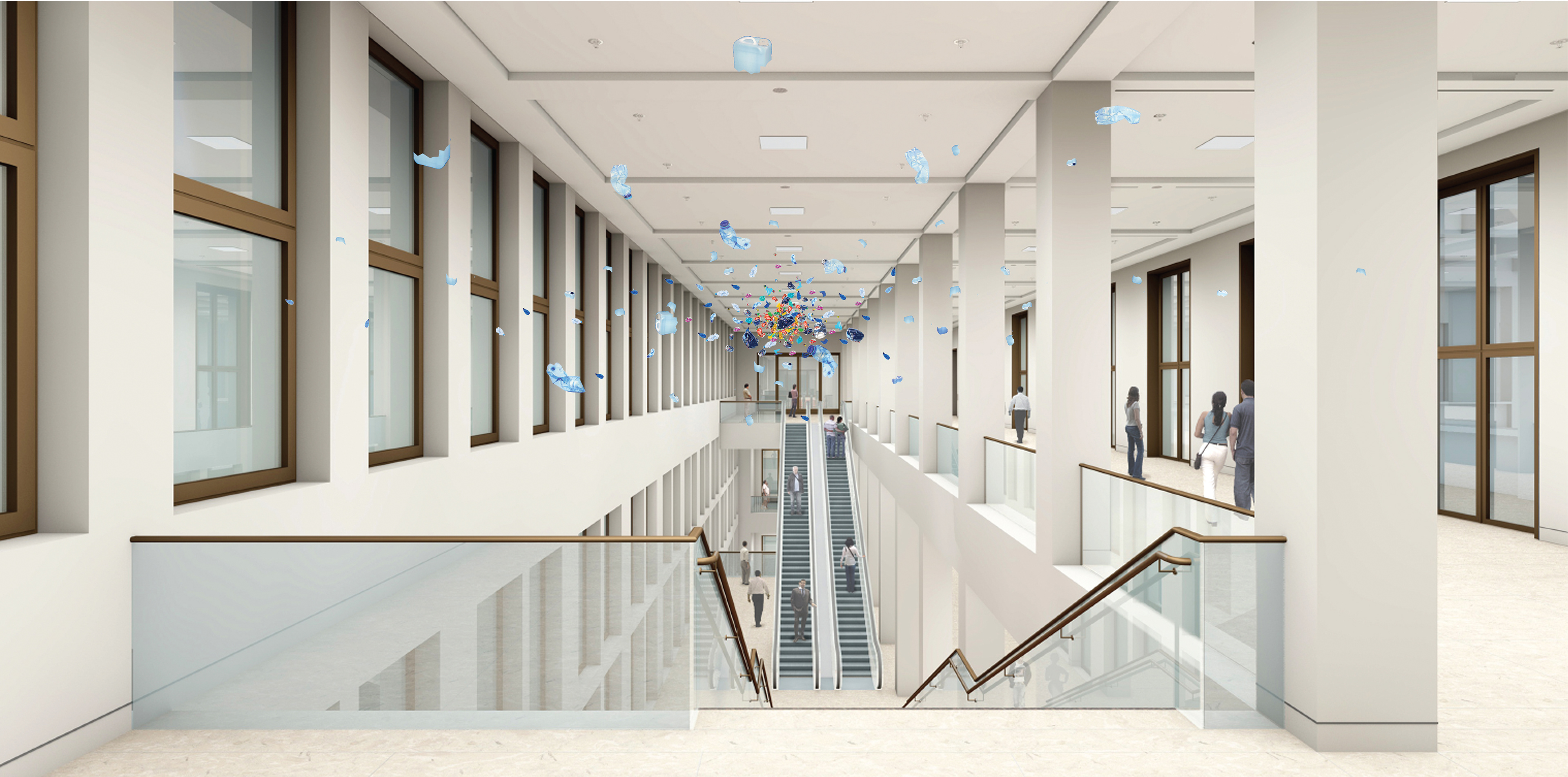 Um den inhaltlichen Hintergrund der Rauminstallation zu vermitteln wird im 2. Obergeschoss zwischen Treppe und Rolltreppe im Boden eine von unten beleuchtete Glasplatte eingelassen, auf der eine Weltkarte mit Verortung der 7 größten Müllwirbel gezeigt wird. (Glasplatte mit rutschhemmender Oberfläche)